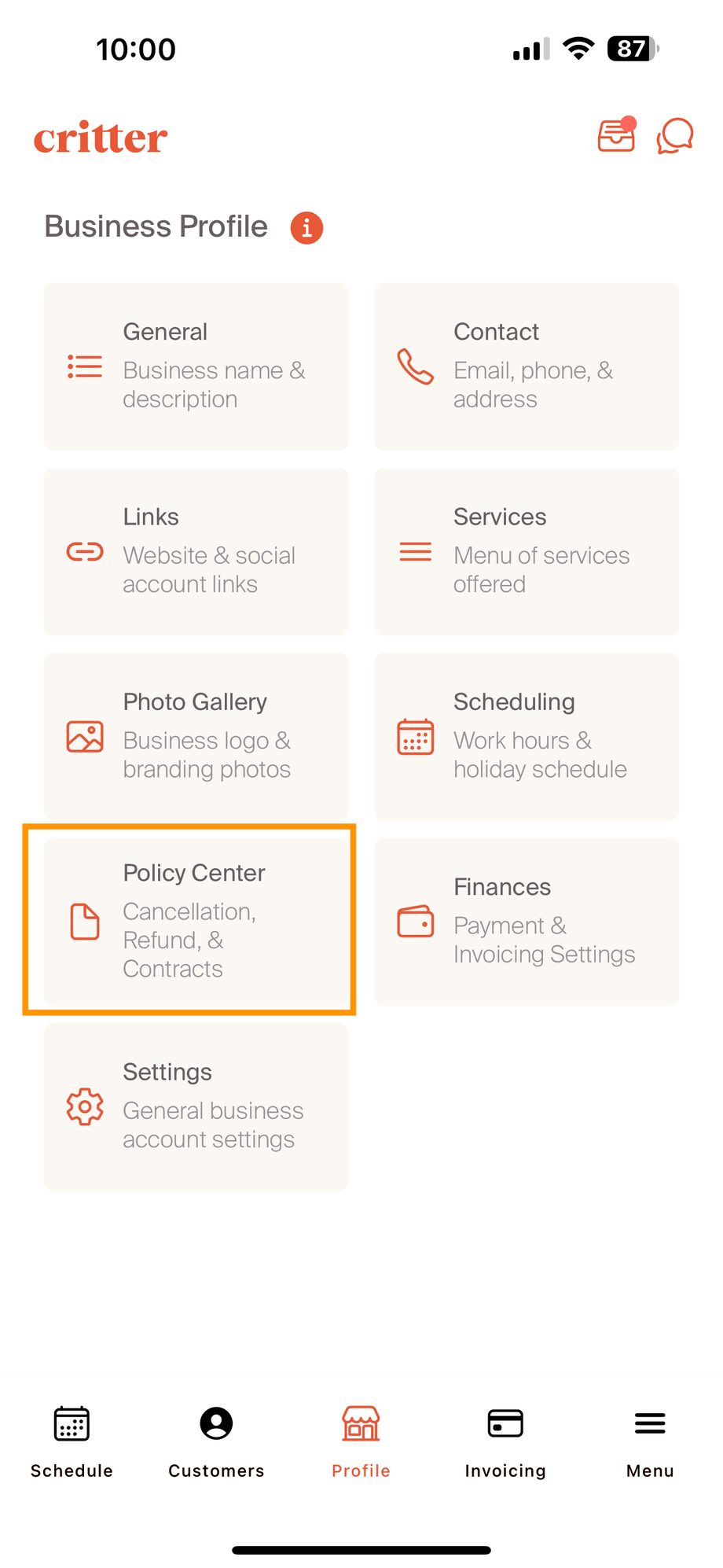 Policy documentation is the source of key documentation for a client's onboarding experience. On the profile page, navigate to the policy center sub-tile.