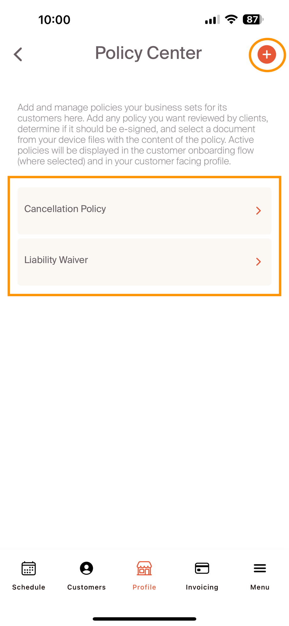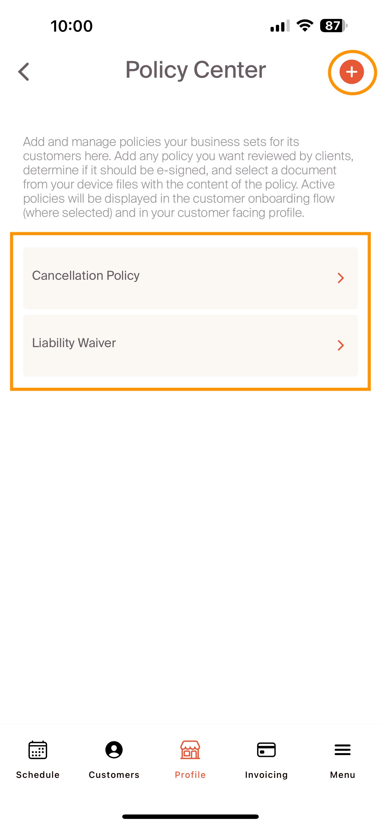 On the policy center page, a professional will see the documents that have previously been uploaded. These documents can be tailored to a professional's business, and can include as many as required to complete an onboarding flow. We see customers upload cancellation policies, liability waivers, as well as other onboarding inputs. Additional documents are added by selecting the "+" sign in the upper right hand corner.
