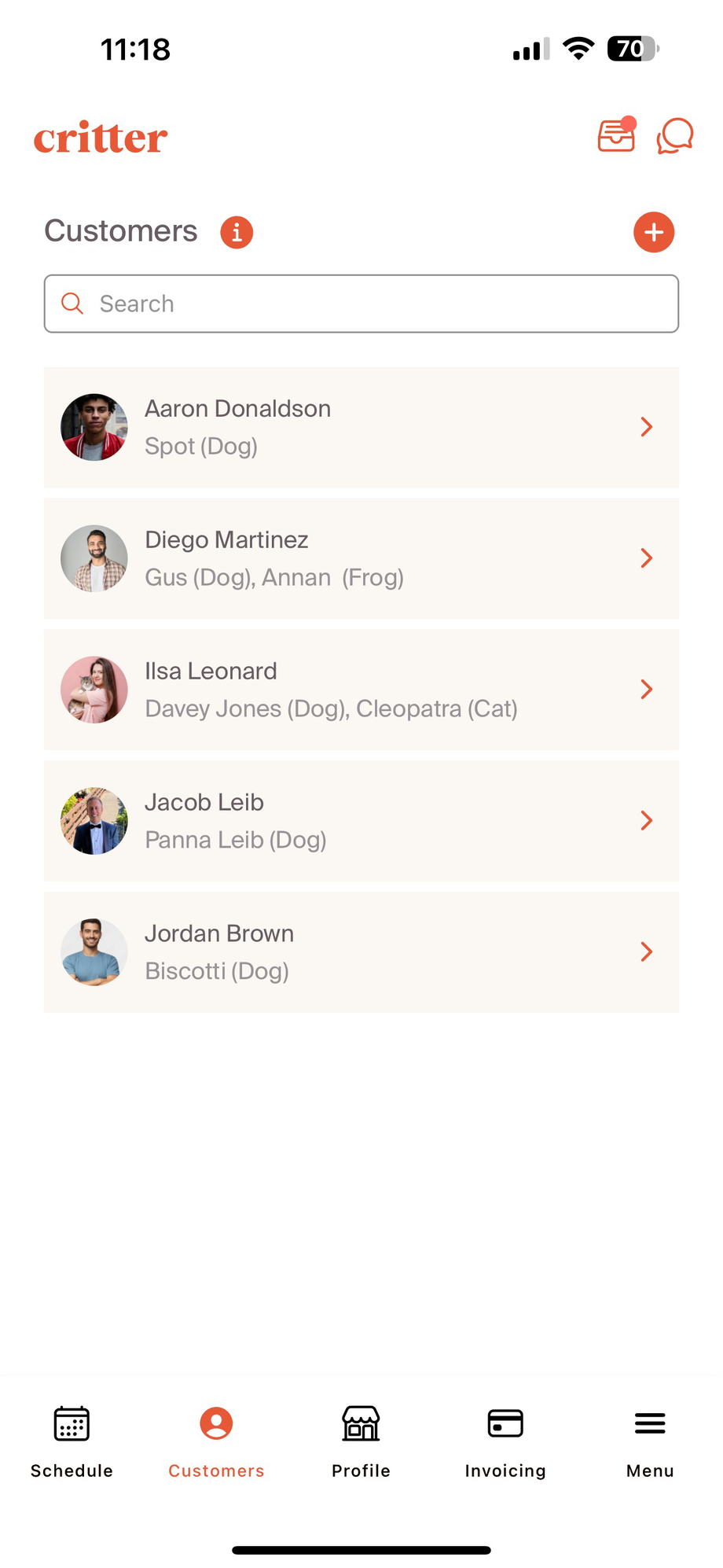 Adding new customers is the first step in the process of creating a new relationship with a client. In order to generate any bookings, invoices, or other communications we first need to add a customer. When we navigate to the "Customer" tab, we will see a list of all of our existing customers. The pets associated with each customer are listed below, with the type of pet show in parenthesis.