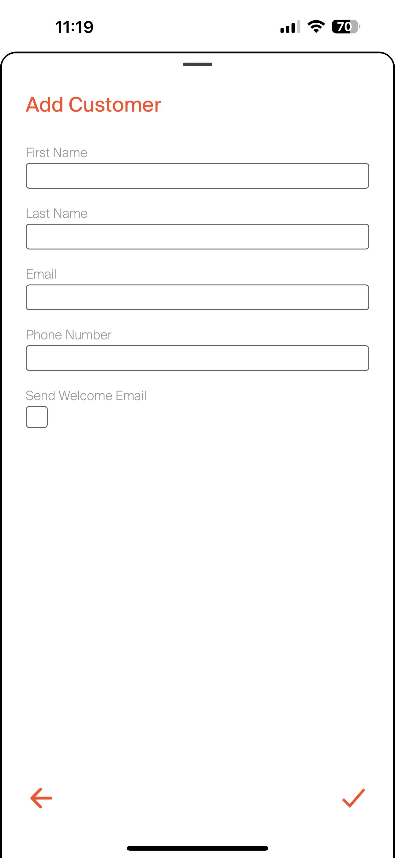 In order to add a new customer, select the "+" sign. This will require basic information to be included for a professional's customer. First Name, Last Name, and Email are required fields. If we would like to include a welcome email, select the "Send Welcome Email" check box