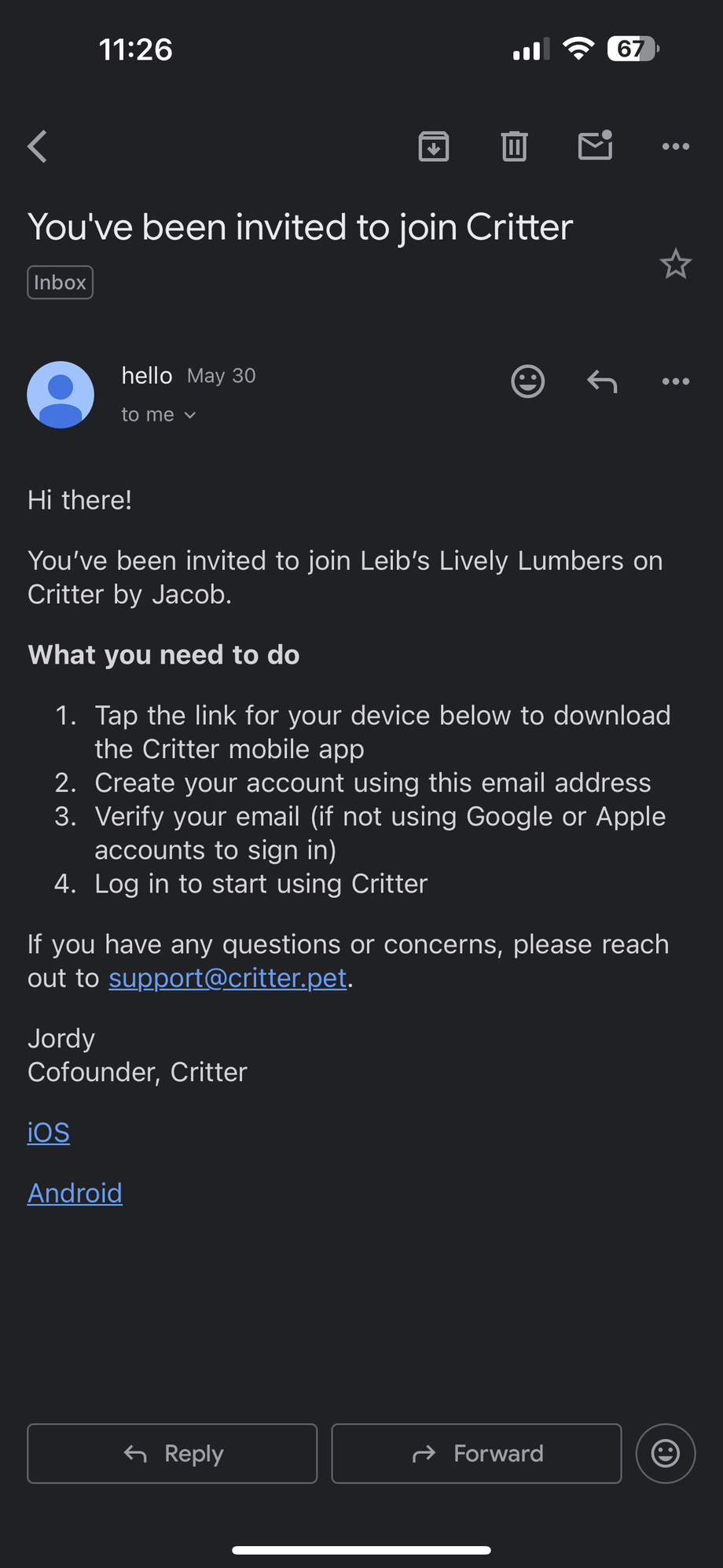 If this customer does not have a Critter Profile already, they will receive a welcome email that will prompt them to create a Critter profile. A sample email is shown below. Pet owners will be able to select their relevant operating system, download the app, and create a Critter profile.