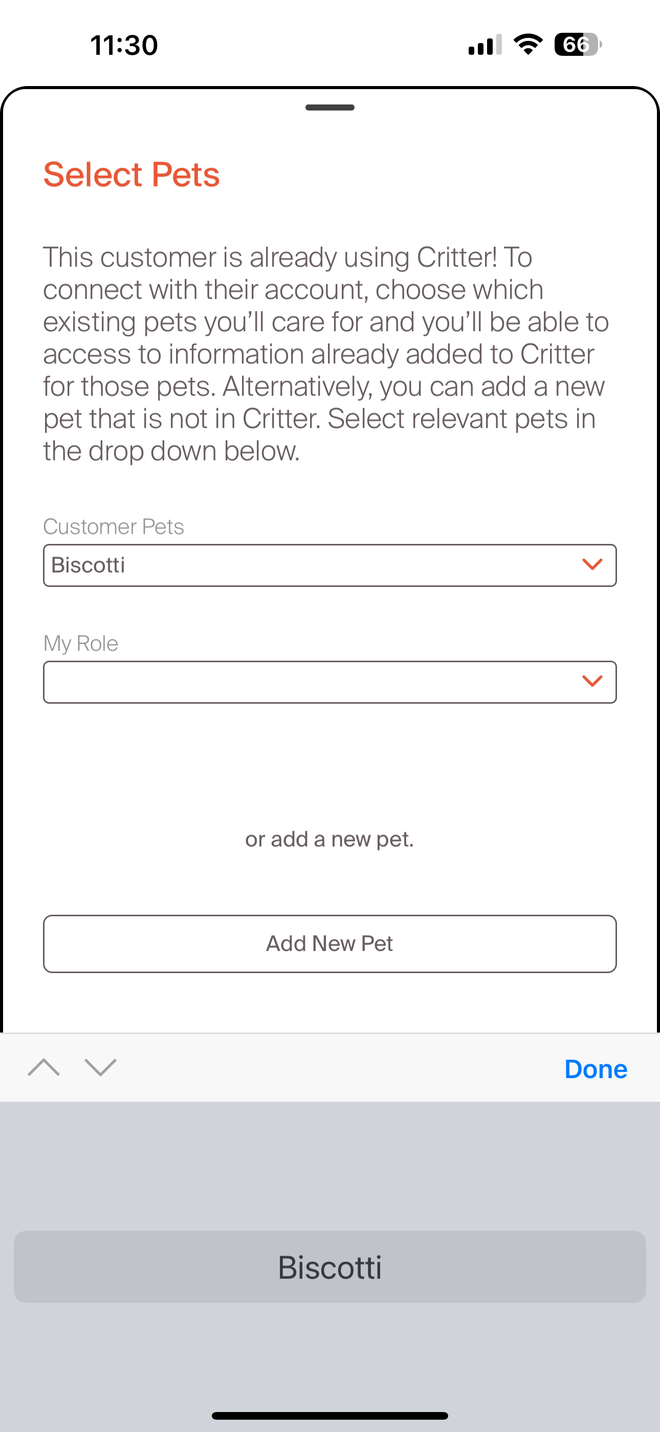 If the customer already has a Critter profile, a professional will be prompted with a message to select the pet associated with the potential customer. In the screenshot below, we can see the pet linked with the customer profile that you had added. If we need to add a new pet, select the "add new pet" option.