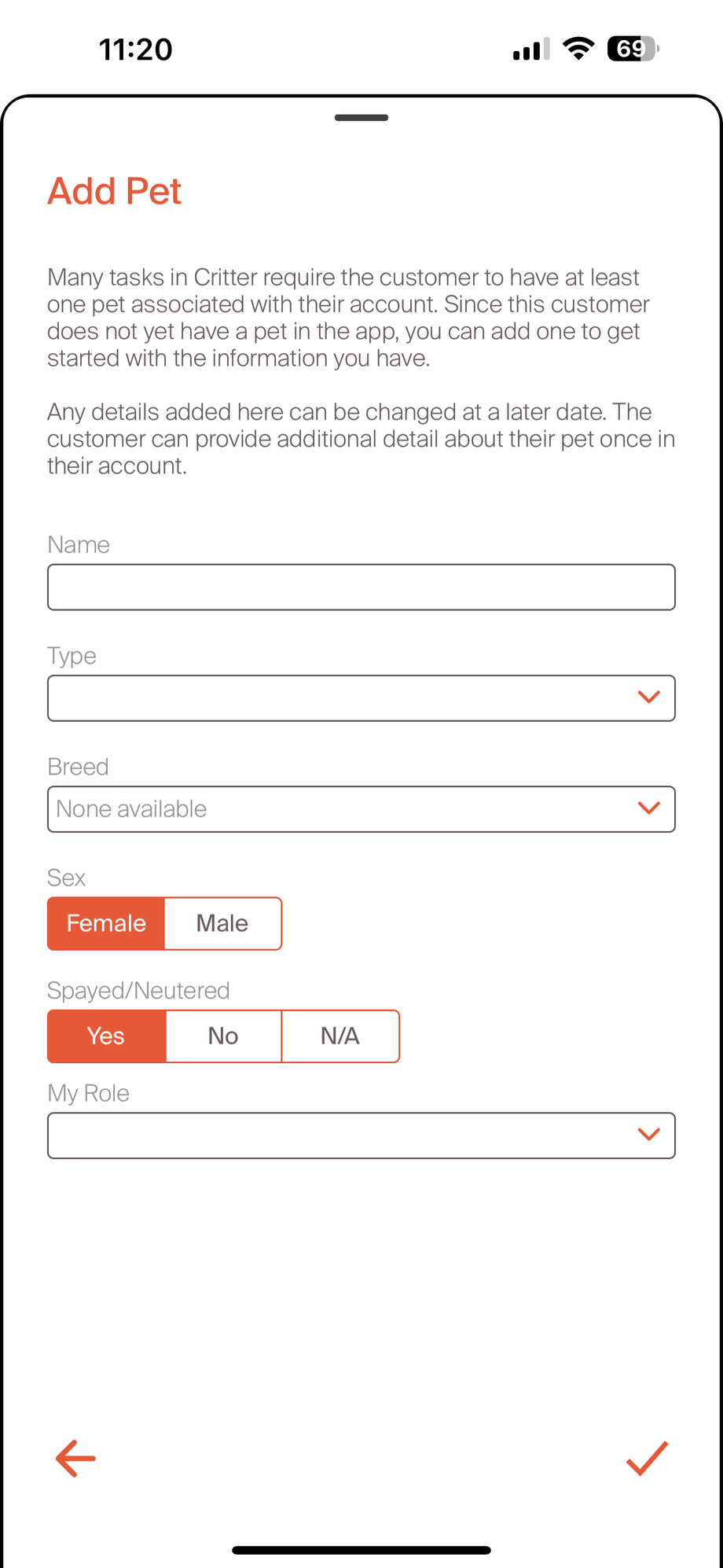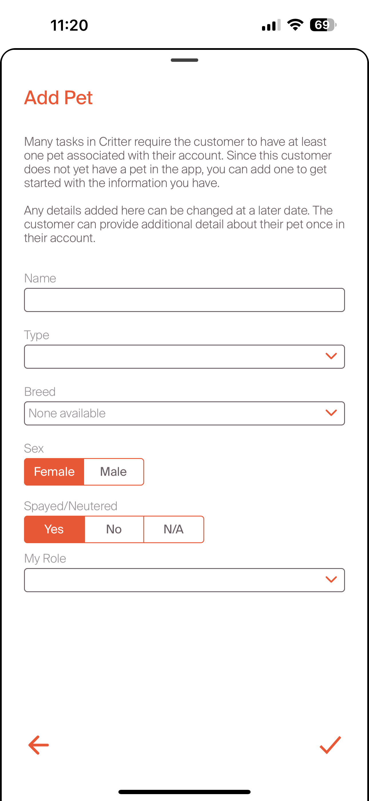 Adding a new pet will require adding basics, including "name", "type", "breed", "sex", "spayed/neutered", and the professional role. This is the type of professional services that we will be providing (walker, groomer, trainer, etc). Once the pet is created, the owner can populate additional information in the care plan and timeline as part of the pet owner experience.