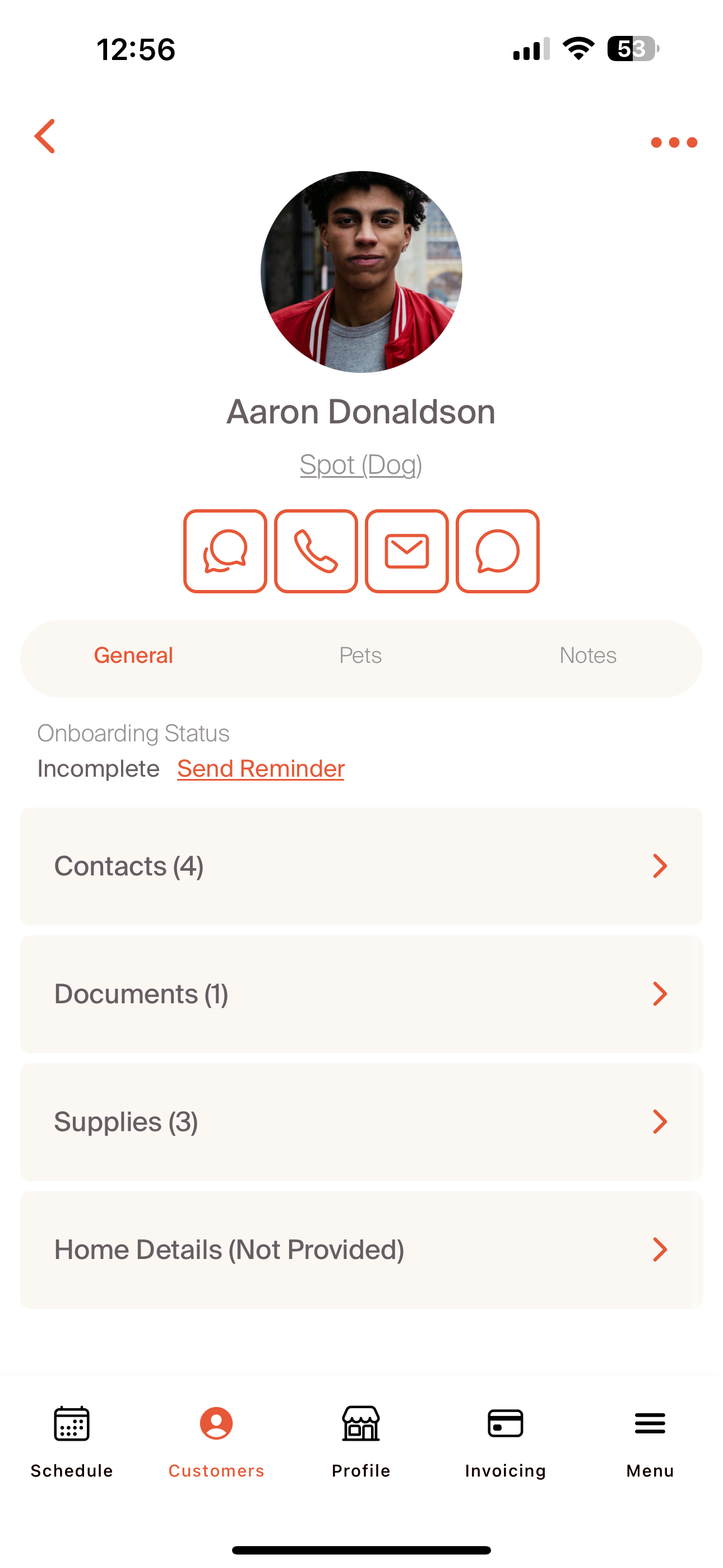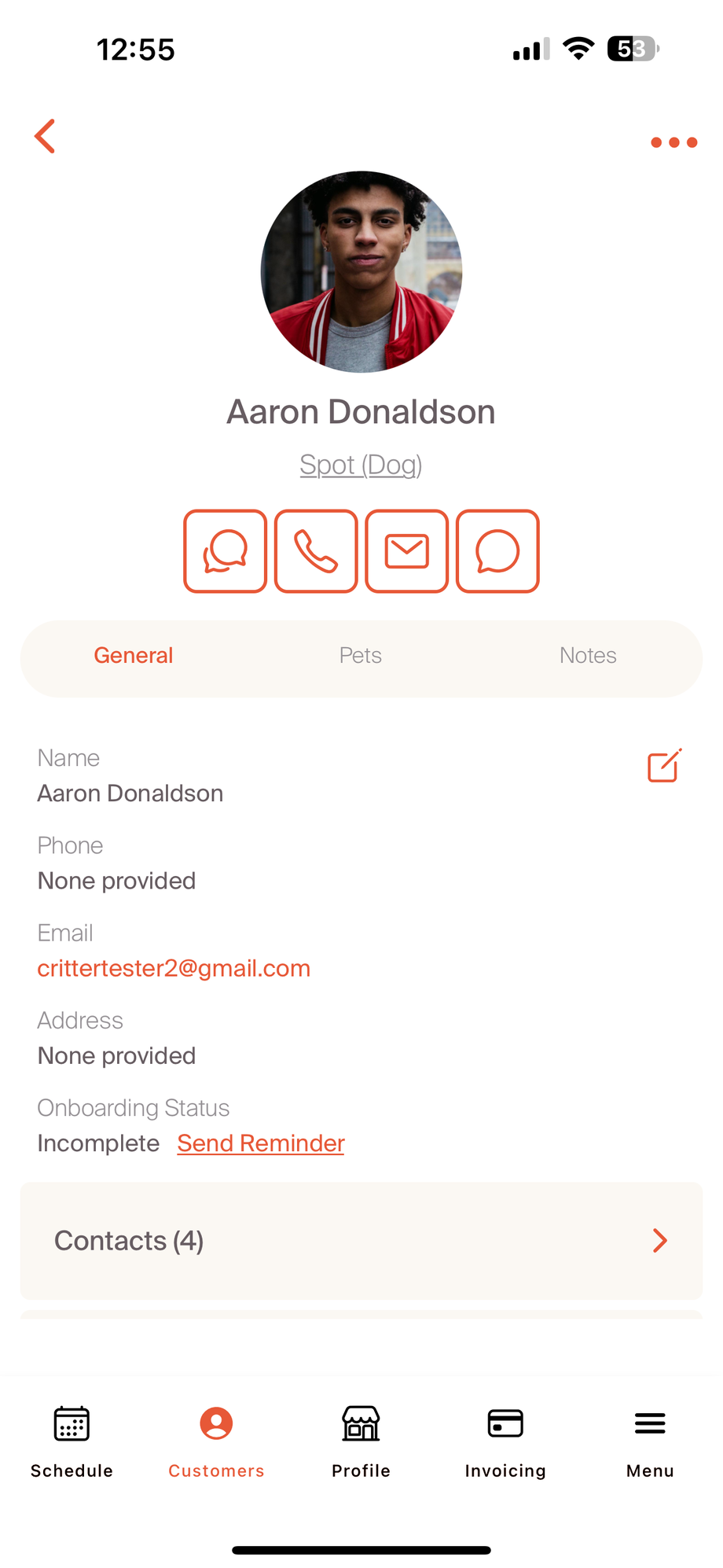 After we create customers, the customer profile becomes the hub for all key information. The profile includes the customer's name, phone, email, address, and onboarding status. If the onboarding is not complete, we can send a reminder to confirm that they complete the onboarding process prior to the first service. As a reminder, the onboarding process is based on the documentation we upload to the Policy Center during the professional account set-up. The four icons below the customer picture indicate the various ways we can communicate with a customer. From right to left: direct message within the Critter App, call, email, and text.