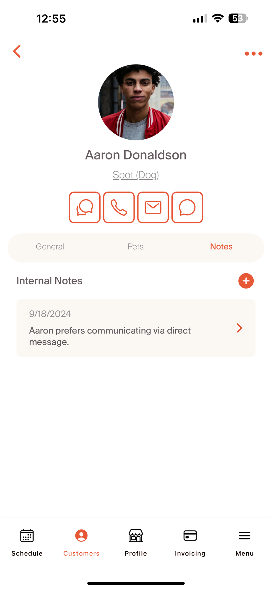 We will cover the "Pets" section of the customer profile in the 'Linked Pets and Pet Profile' section to follow. The 'Notes' tab allows for internal notes to track key elements of the customer relationship. These will all be internal and not shared with the customer.