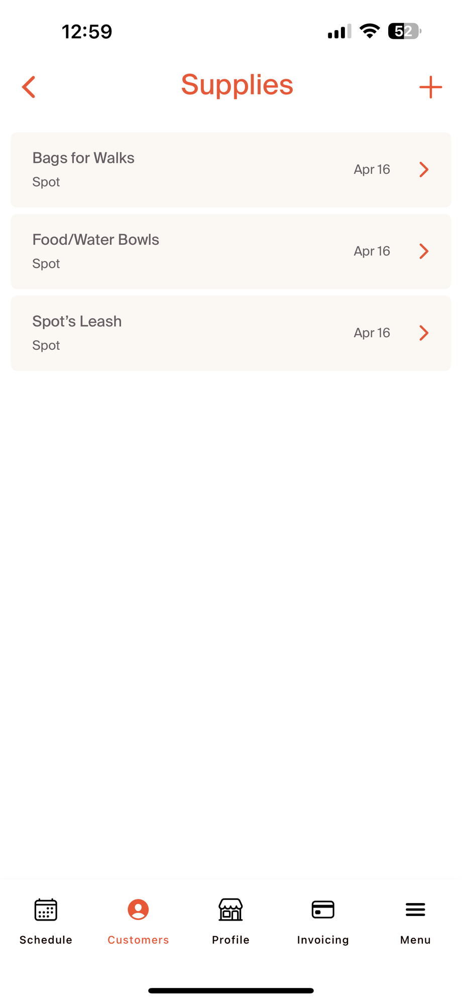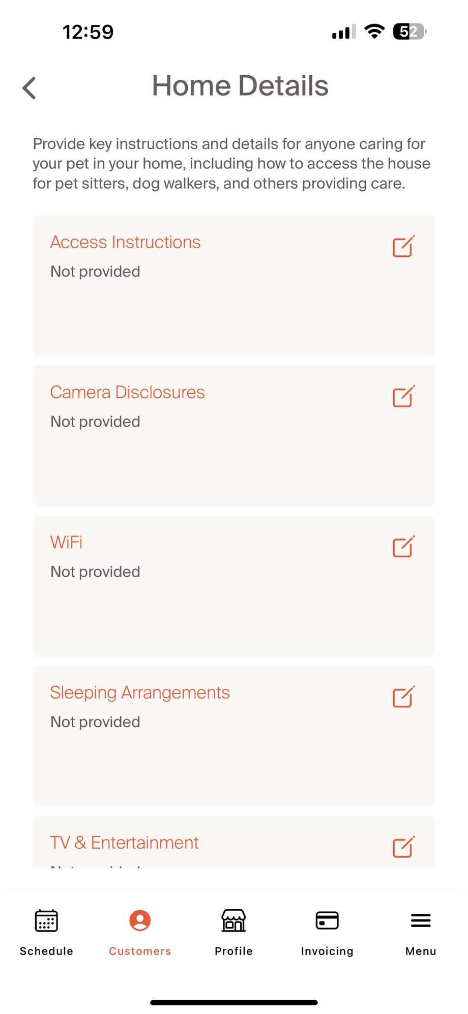 The following four screenshots show an example of the customer profile completed with these details. When we have access to a customer's profile, we have the ability to add notes to these fields based on any changes in the routine. This will allow for new supplies to be added, or any additional home access instructions. This is a good place to capture complete vaccine records or other medical inputs that will be beneficial for a high quality service.