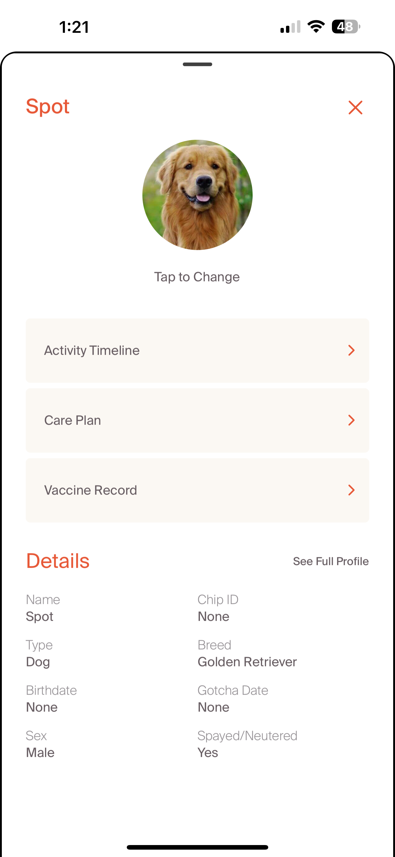 On the profile, we have three options: Activity Timeline, Plan, and Vaccine Record. In addition, we can quickly see the key details including Name, Type, Birthdate, Sex, Chip ID, Breed, Gotcha Date, and if they're Spayed/Neutered.