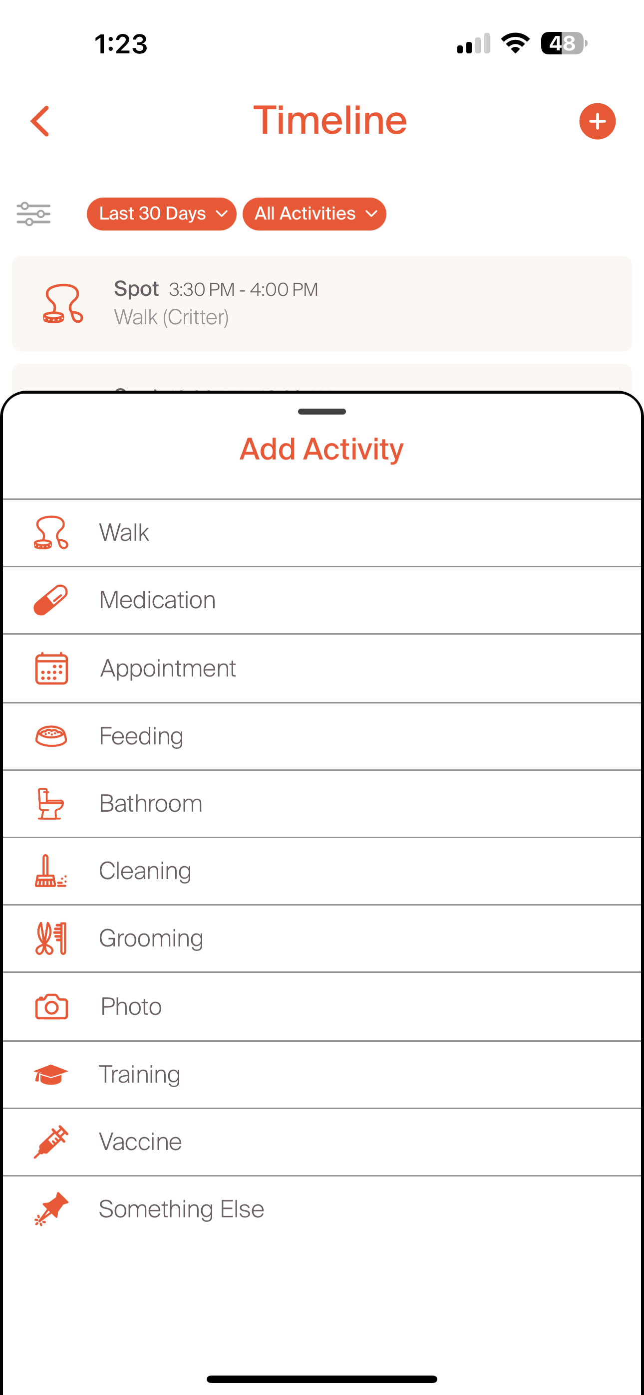 The activity timeline and care plan are the areas where we can collaborate with pet owners to continually improve the care experience. The activity timeline is where we can post services that are complete. This can be done directly on the timeline as shown in the screenshot below, or by submitting a service report. We'll explore the service report further during the services deep dive. The timeline posting can be any activity and can be posted by the pet owner or the pet professional.
