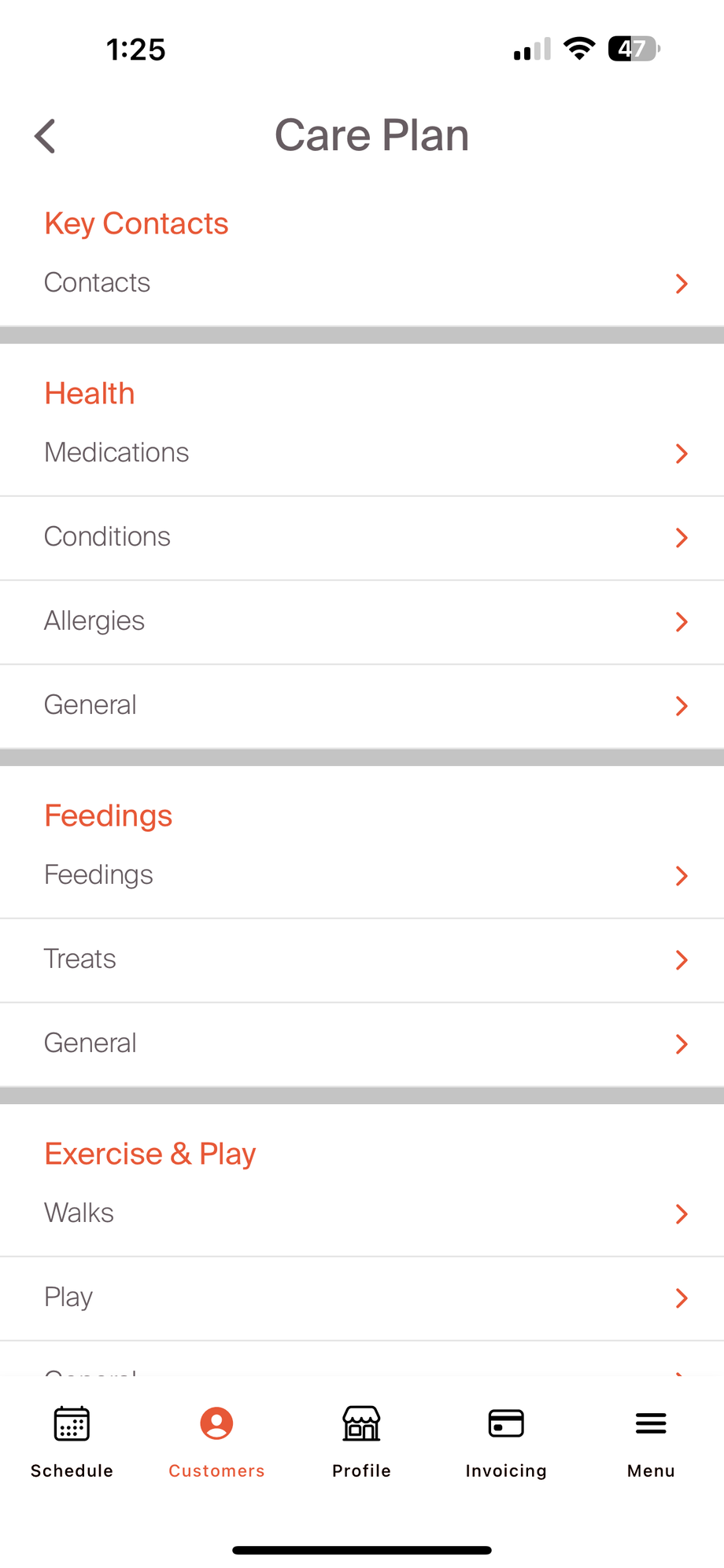 The care plan allows us to manage a collaborative care approach for the pet. This is where we capture key details of a pet's care, broken out by critical care areas. These include Key Contacts, Health, Feedings, Exercise & Play, Grooming & Cleaning, Sleeping, Behavioral, and any other key notes.