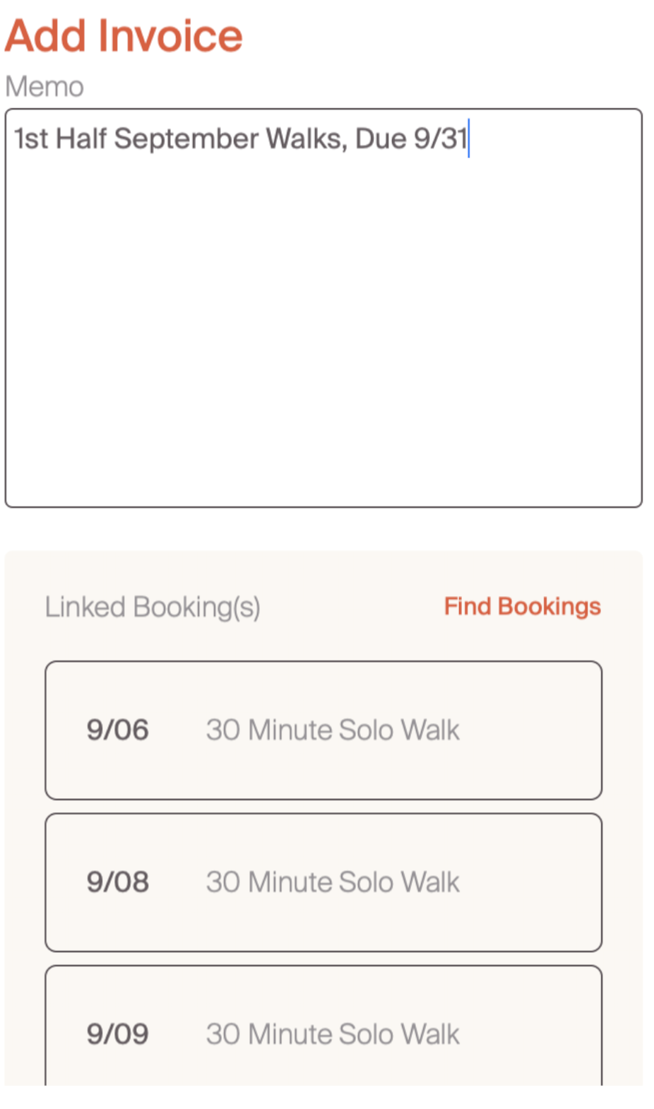 The next step in the process is to add a memo and chose to link bookings. Memo will appear on the invoice, and is useful for customers to understand exactly what the invoice is for. Linked bookings are very helpful as it will pull in the information for the services booked into the invoice process. This will include default pricing.