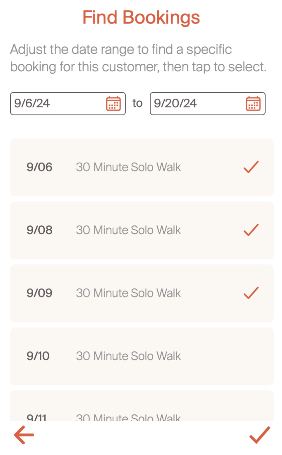 To include linked bookings, select the "find bookings" in the upper right hand corner. Check the relevant bookings, and select the "check" mark in the bottom right hand corner. You can filter the time period that you would like to see services for. If you invoice for services in the future, you can search for bookings once they are created.