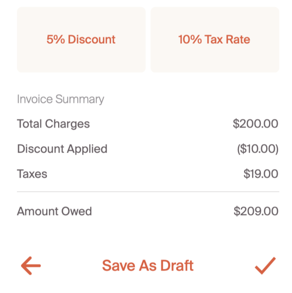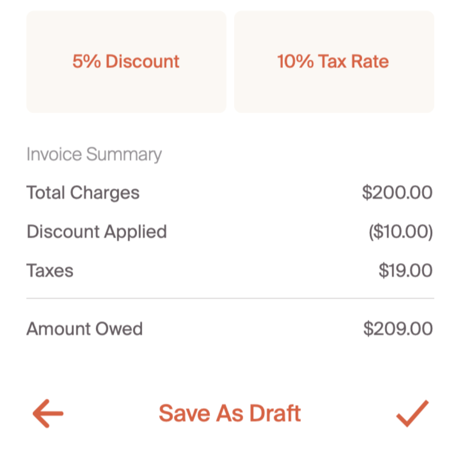 The Discount and Tax Rate buttons allow for percent based adjustments to the final invoice. These are calculated in the below field to create a final dollar amount. If a percentage is added, it will appear on under the relevant field as show in the screenshot below.