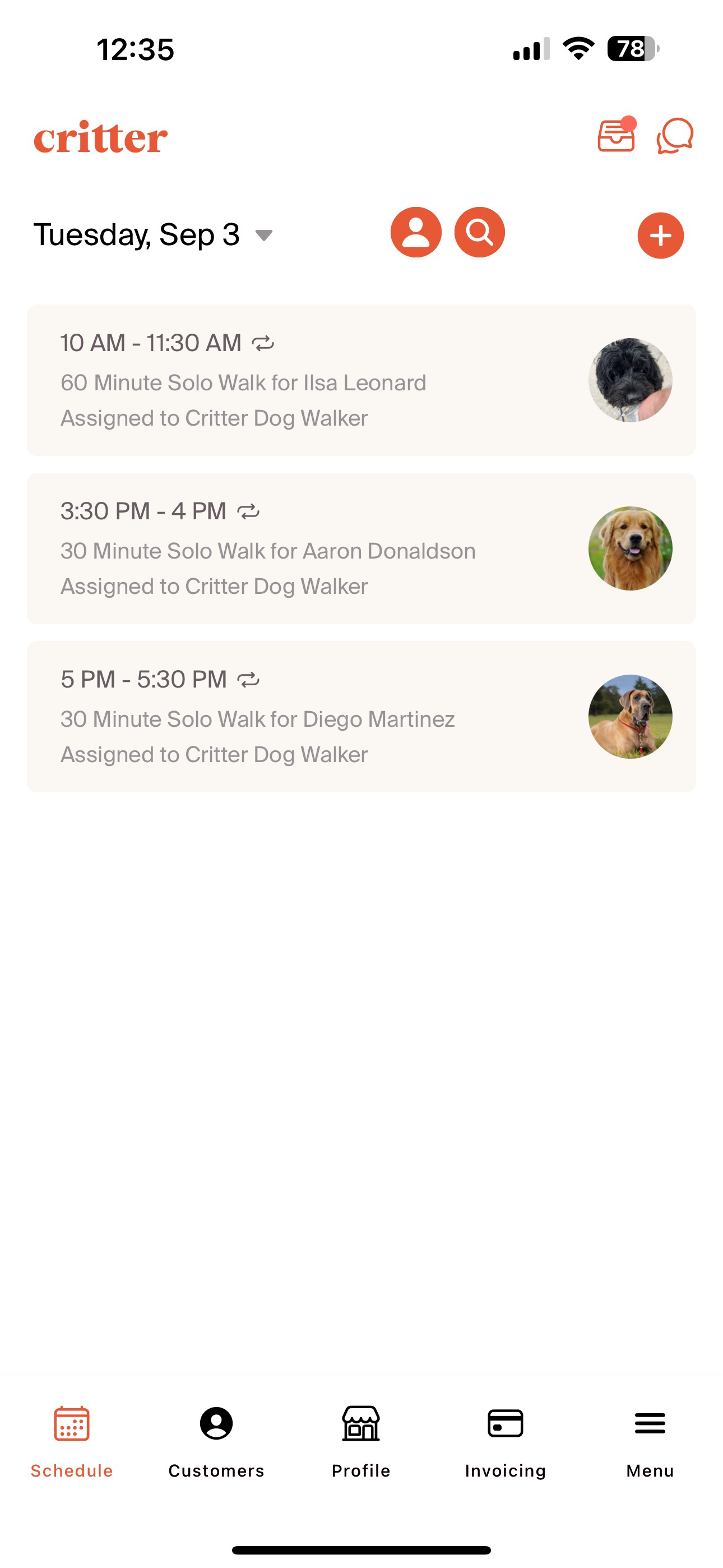 Navigation in Critter is driven by the five icons on the bottom of the application. In the screenshot below, we can see the following sections (from left to right): Schedule, Customers, Profile, Invoicing and Menu.